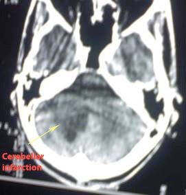 CT revealed right cerebellar infarction (arrowed).