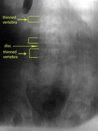Notice:- very faint bone density - thin vertebra